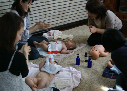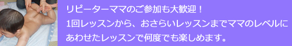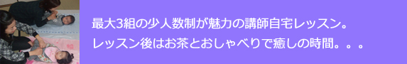 大勢の中では緊張してしまうお母さんにもぴったり。 今の、ちょっと分かりづらかった・・・など 質問しづらいこと遠慮せずおっしゃってくださいね。 お母さんひとりひとりのペースも大切にしています。 赤ちゃんが泣き出しても、眠ってしまっても大丈夫。 レッスンは赤ちゃんそれぞれのペースを大切に進めます。 後で、出来なかったところを個別にお教えしますので、安心してくださいね。